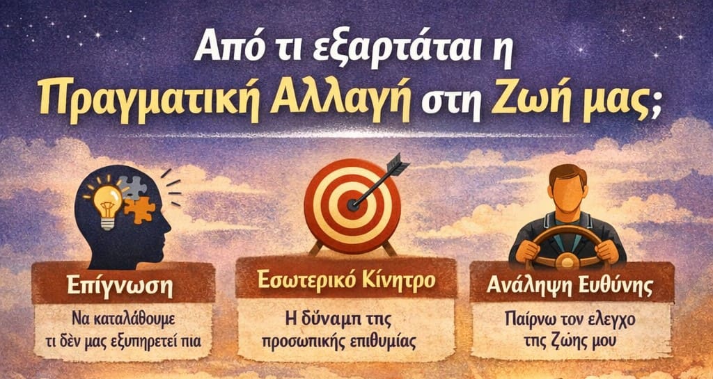 Αν κάνουμε το επόμενο βήμα θα βοηθήσουμε τον εαυτό μας να μας βοηθήσει κι αυτός να σχεδιάσουμε και να κάνουμε την πρώτη, έστω και μικρή αλλαγή. Να η νέα αρχή! Το επόμενο βήμα γίνεται σχεδόν αυτόματα, τώρα που αρχίσαμε να κινούμε τα νήματα της αλλαγή στην ζωή μας. Είναι δική μας υπόθεση, από εμάς αρχίζουν και τελειώνουν όλα. Δες το βίντεο που θα σε βοηθήσει να σκεφθείς τι πραγματικά πρέπει να αλλάξεις στην ζωή σου για να αισθανθείς ευτυχία. {Play}