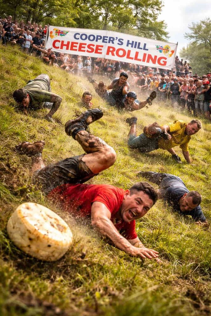 Το Cheese Rolling θεωρείται στα social media το πιο αστείο άθλημα του κόσμου. Το επίσημο όνομα της δραστηριότητας, που γίνεται στην Αγγλία, είναι Cooper’s Hill Cheese Rolling and Wake και το καλύπτουν πολλά δίκτυα του κόσμου. “Στίβος” του αθλήματος είναι ένας ιδιαίτερα απότομος λόφος, οι αθλητές τρέχουν ή κατακρυλούν δίπλα σε ένα μεγάλο κεφάλι τυρί και κερδίζει αυτός που φτάνει πρώτος στο τέλος, ανεξαρτήτως της πορείας του τυριού και της επιτυχίας του να το πιάσει αφού ή ταχύτητα που αυτό αναπτύσσει φτάνει και τα 100 χλμ/ώρα.